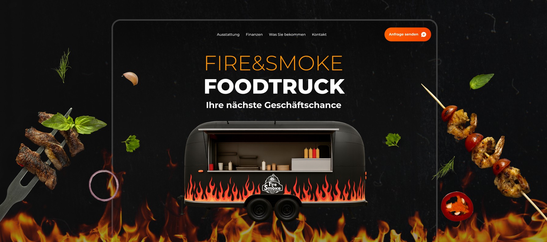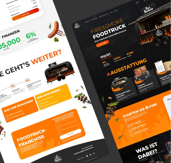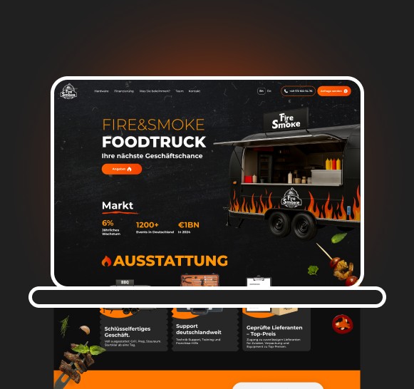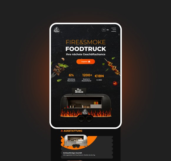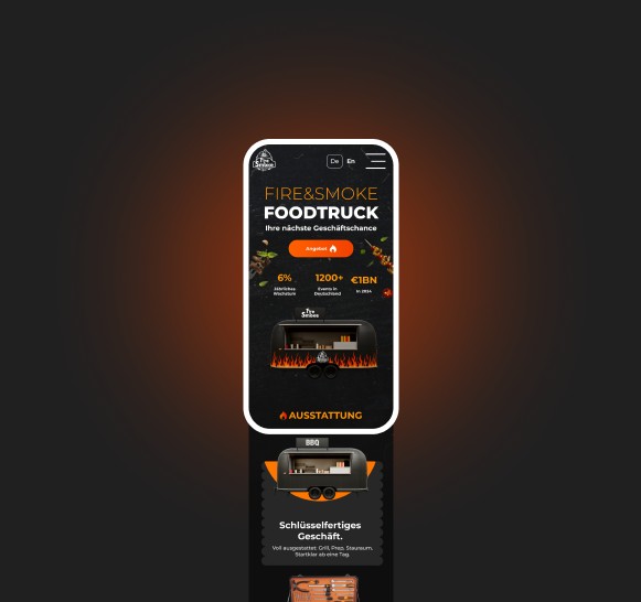 Wir haben uns bewusst vom typischen „Foodtruck-Landingpage“-Ansatz entfernt. Fire & Smoke steht für Metall, Feuer, BBQ und die Bewegung der Stadt. Unser Ziel war es, dieses Gefühl einer Premium-Marke zu vermitteln – sodass der Nutzer Teil davon werden und eine Anfrage hinterlassen möchte.